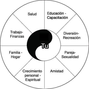 Idea esquemática de cómo buscar equilibrar todos los 8 campos que muestran la rueda de aquellas situaciones que nos pueden, por apegos, desequilibrar y por tanto impedir nuestro bienestar final y confundir éxito con realización personal: